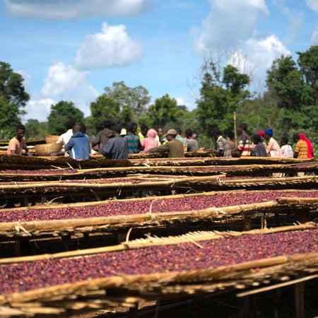 Farmers deliver ripe cherries to the Gizat washing station, where they undergo a meticulous sorting process to ensure only the best cherries are selected.